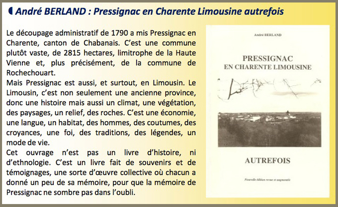 églises du canton de Chabanais » (2014) 12 - « Le château de la Chauffie à Pressignac » (2016) 13 - « Sabotage à Pressignac, le 11 octobre 1943 » (2019) 14